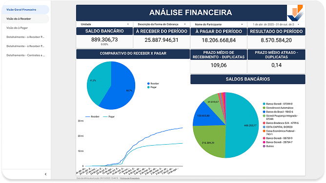 Dashboards e relatórios inteligentes oferecem informações em tempo real, apoiando decisões financeiras, operacionais e gerenciais.